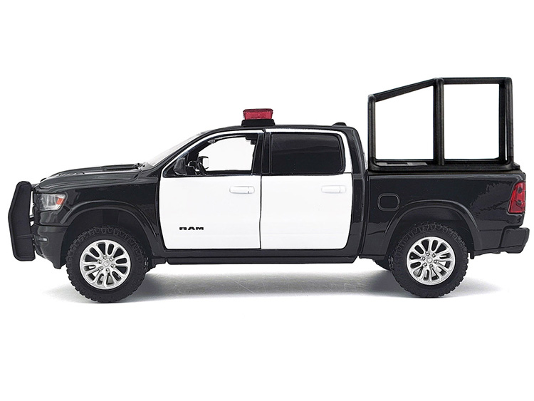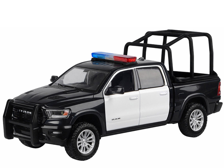 Motormax 79545 2019 Ram 1500 Laramie Crew Cab 1:27 with Stand Cage & Light and Sound Black / White